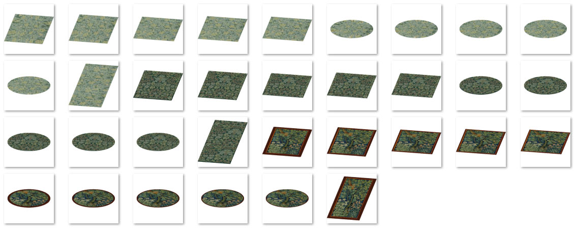 The concept of this catalog is to provide 3D Objects for common rug sizes - any material pattern can be applied to any rug.