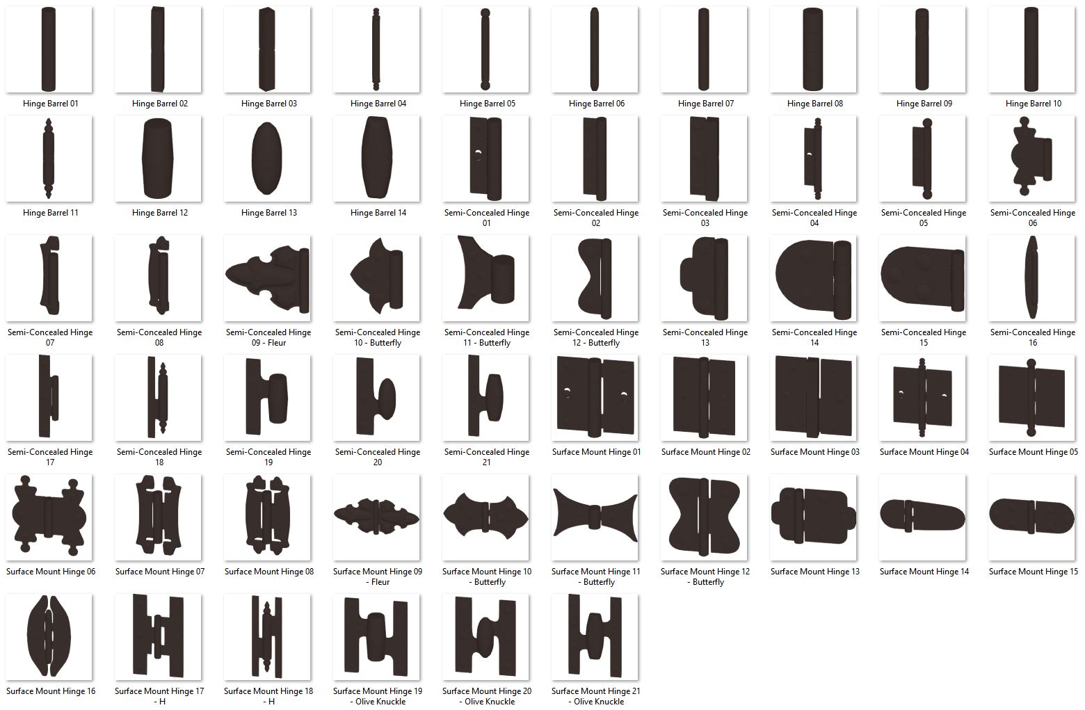 Hinge barrels, semi-concealed hinges, and surface mount hinges in a variety of shapes and sizes can be used to add detail to cabinets, furniture pieces, and doors.