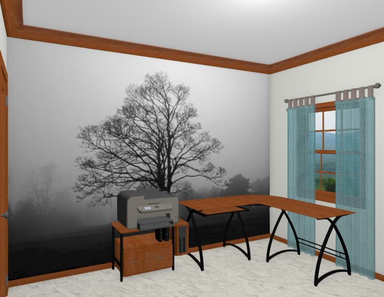 I got bored with the same old paint colors, wallpapers, and with the difficulty of applying murals. My wall has one of the program's core artwork pictures. You can even save one of your own photos and save it as a new material. Cool idea, and easy to do.