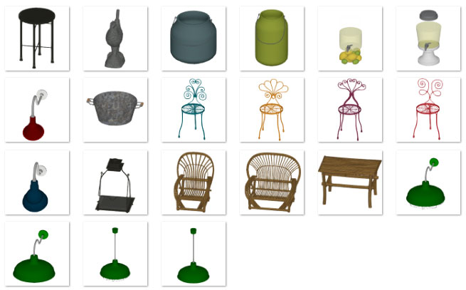 More items in the Country Chic style, these are well suited to outdoor spaces like patios, gazebos, decks, verandas, and the such. Includes barn-style lighting, outdoor furniture and accessories like lemonade towers. Don't forget the giant chicken!