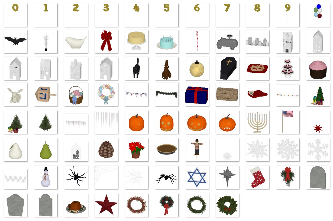 Decor and accessory items with themes of popular seasonal holidays. Create fun and interesting scenes to depict lived-in spaces.