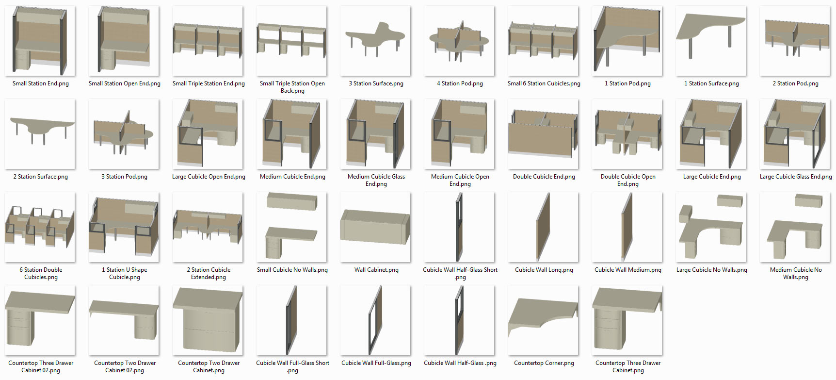 Cubicle partitions, cabinets, counters, modules, and work stations help to visualize available space and flow for offices and professional areas.