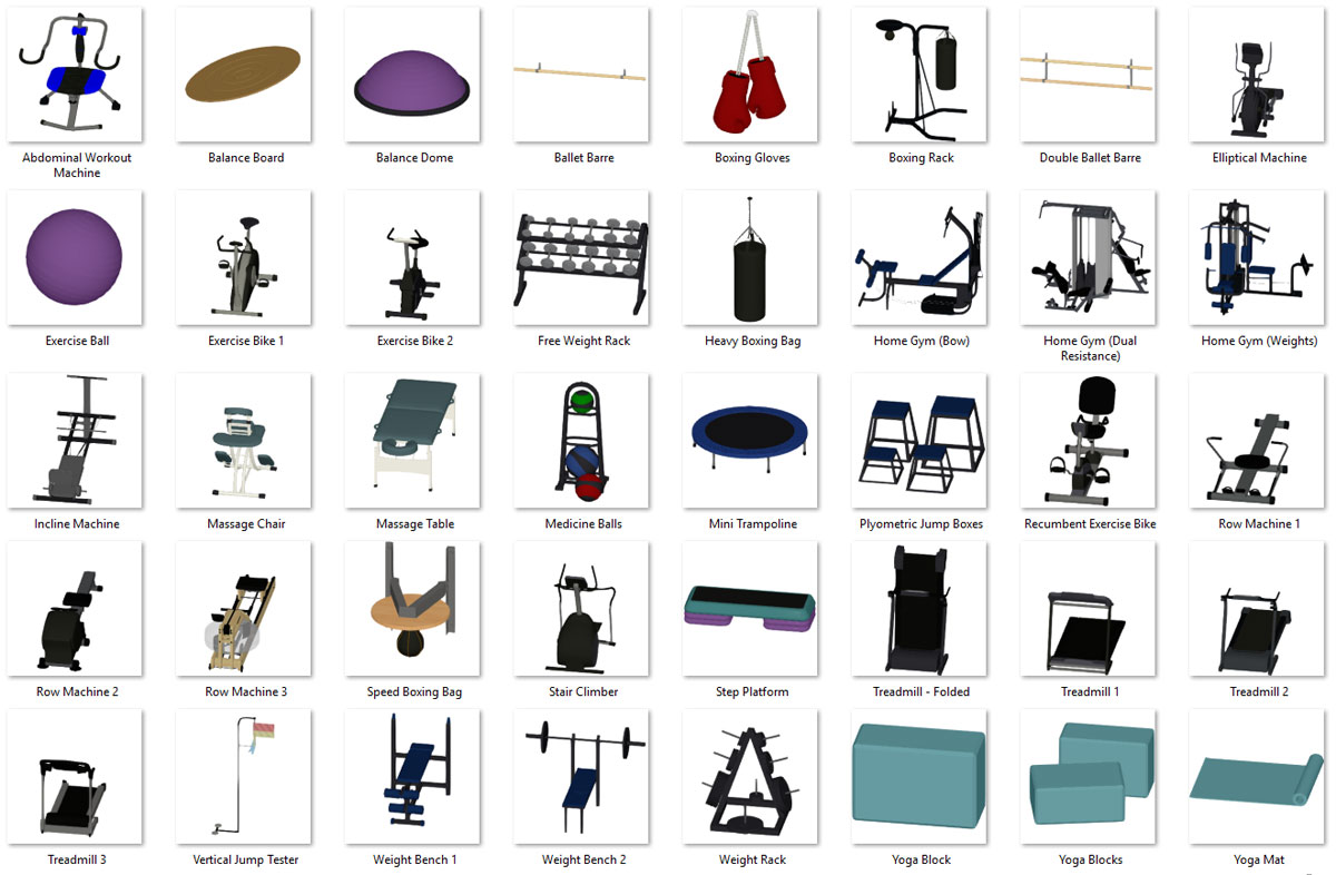 Home Fitness Objects. Plan work-out, dance, yoga, and other spaces for custom Home Gyms.